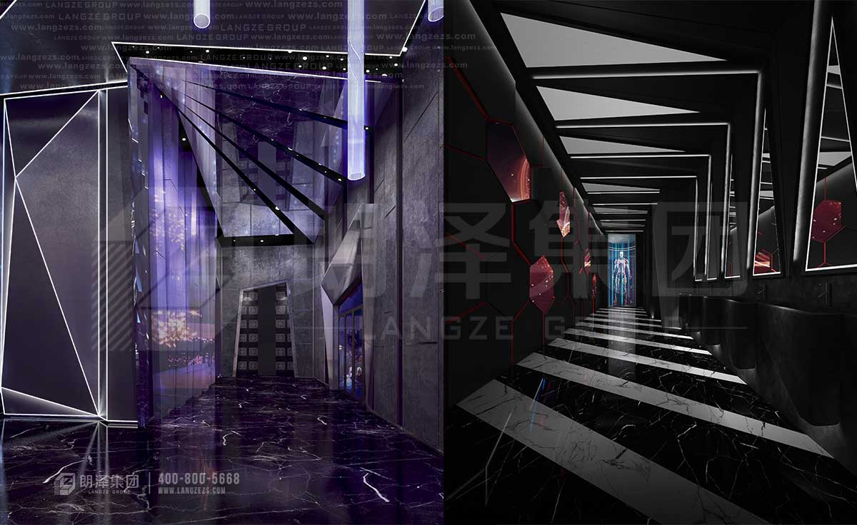 酒吧大廳層高近15米,沉浸式電音劇場,頂部采用機(jī)械組合,直徑10米的圓環(huán),周邊觸手圍繞,震撼至極,在整個(gè)精心切割的空間中,光影無限變幻。切割的過道,讓狹長的過道,富于眾多變幻。