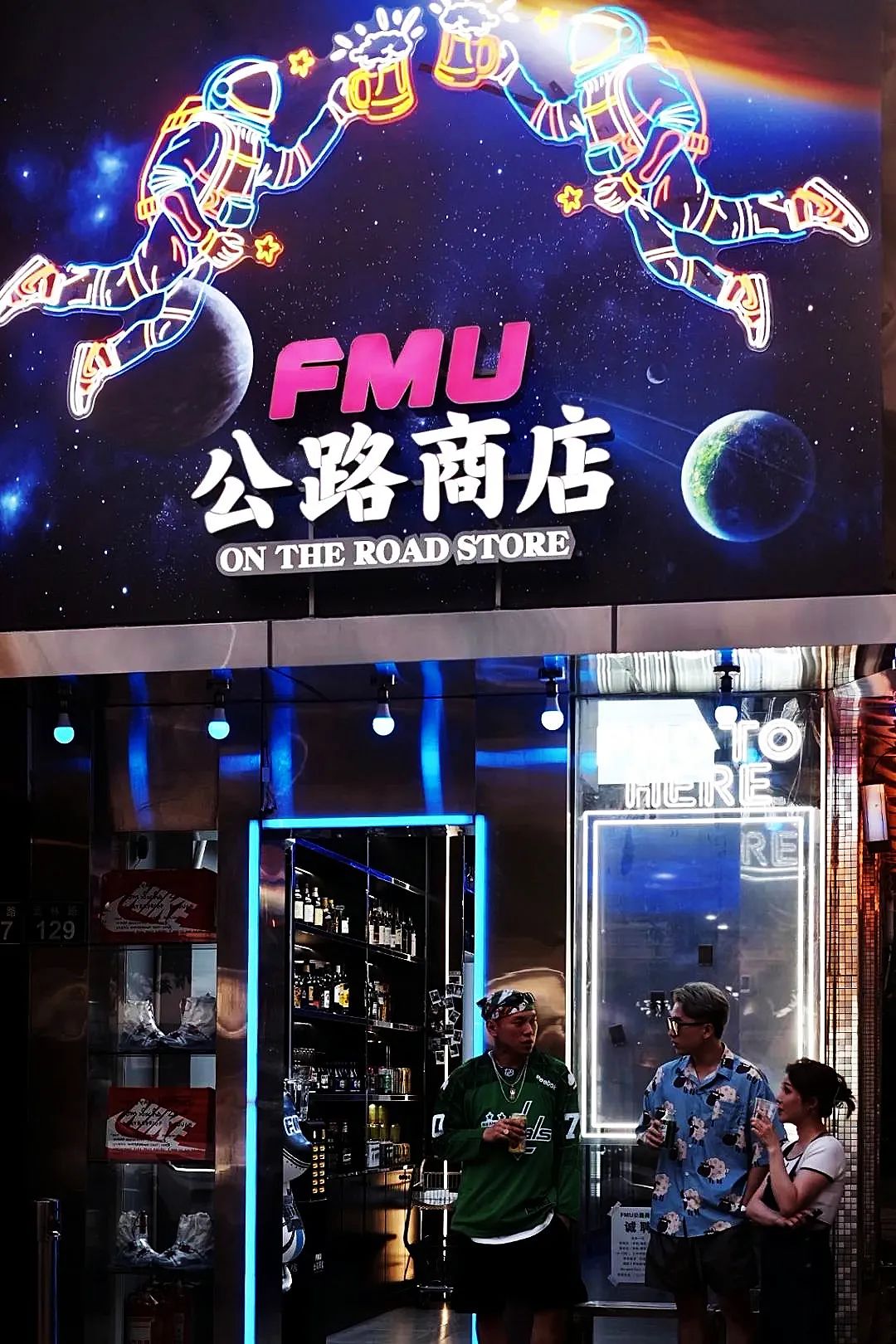 「FMU公路商店」選址杭州武林夜市旁,整店以“航空”為主題,整體呈現(xiàn)深藍(lán)色調(diào),星空銀河、宇航員等元素充斥其間。